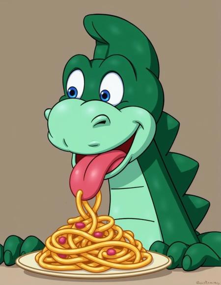 - green dinosaur eating spaghetti