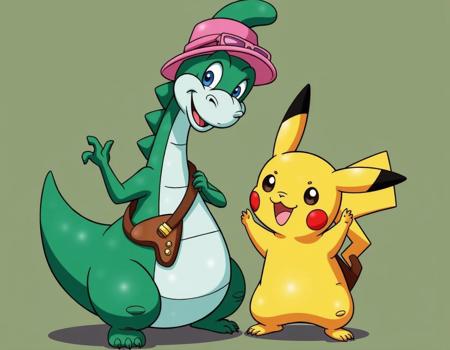 - A green dinosaur dressed as a Pokemon trainer standing next to a Pikachu