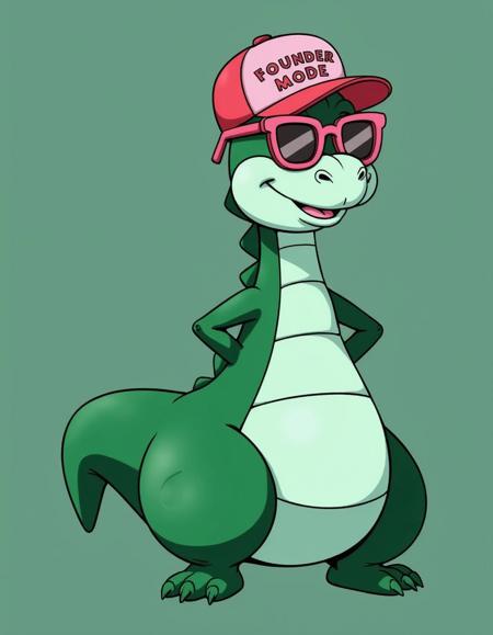 - green dinosaur wearing a "Founder Mode" cap