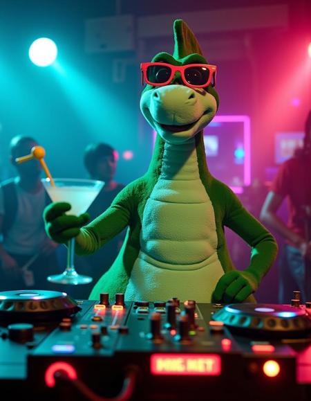 - A green dinosaur is a DJ at a night club, fish eye lens, smoke machine, lazer lights, holding a martini