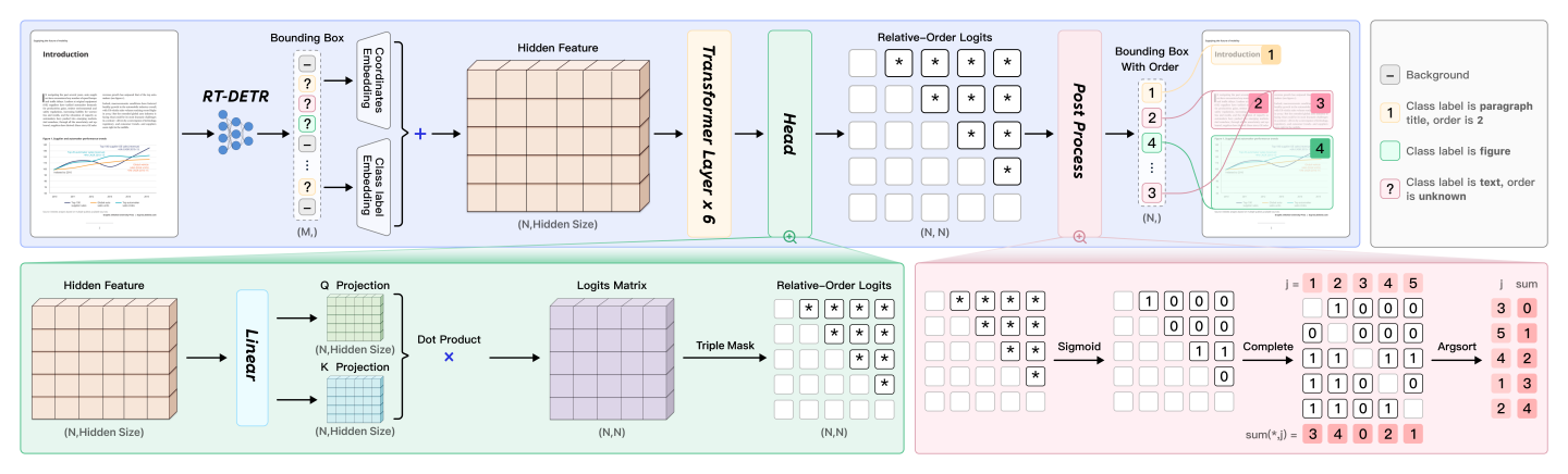 PP-DocLayoutV2 is composed of two sequentially connected networks. The first is an RT-DETR-based detection model that performs layout element detection and classification. The detected bounding boxes and class labels are then passed to a subsequent pointer network, which is responsible for ordering these layout elements.