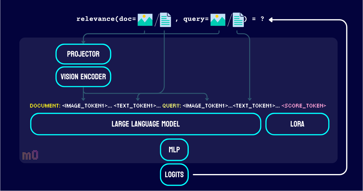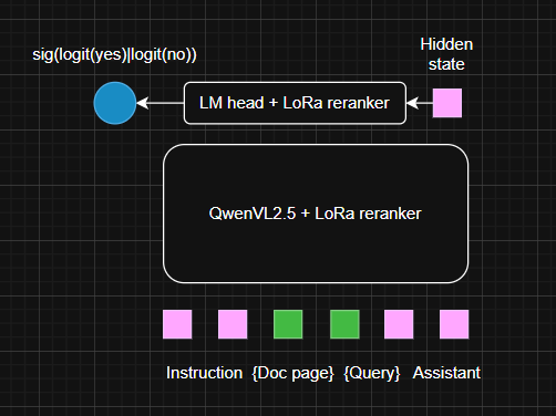 The first multimodal reranker I encountered, and still the SOTA to my knowledge, is Jina reranker m0 and is based on Qwen2-VL 2B. It uses an MLP layer that outputs the scalar relevance score from the hidden state of the final token in the context, which contains the concatenated query and image document.