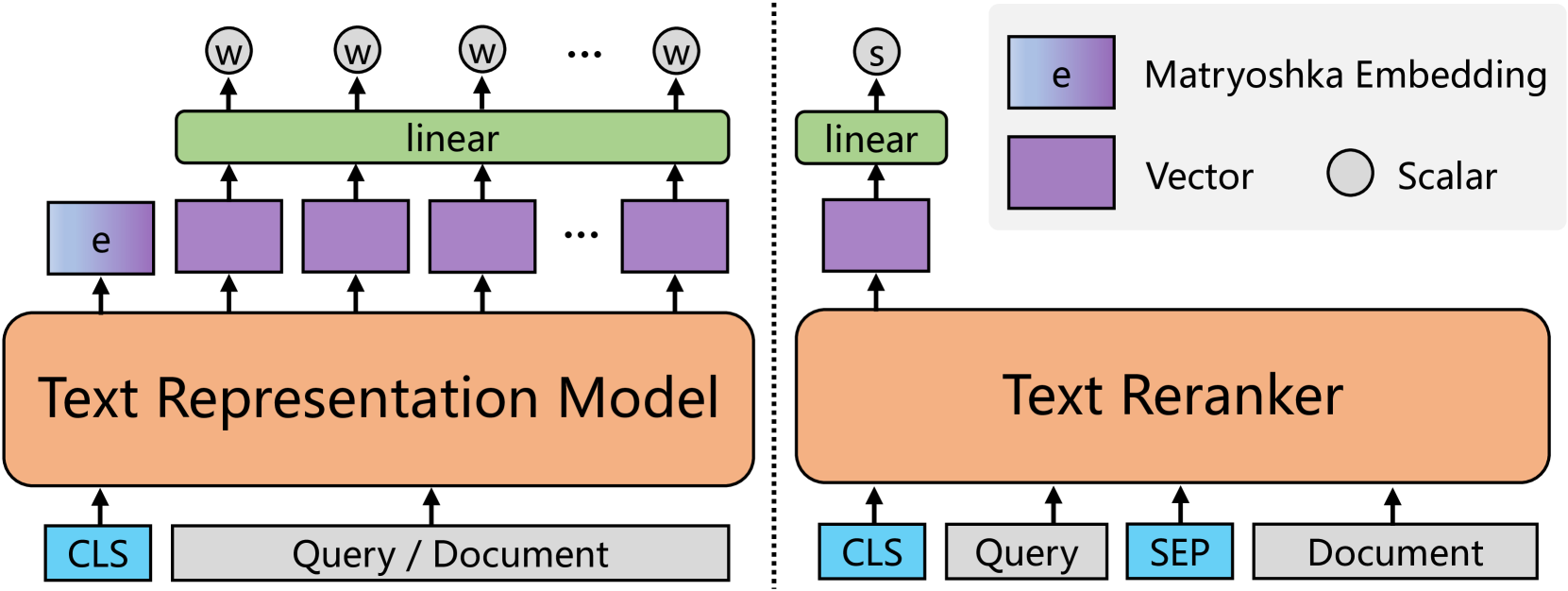 The base model is presented as the same for both the M-GTE retriever (a bi-encoder) and the reranker. However, the reranker is post-trained to output a scalar that represents the relevance between a query and a document in a cross-encoder manner. This is similar to how BERT was trained on the Next Sentence Prediction (NSP) task, where it was given sentence pairs and asked to score whether they follow each other, and also similar to the Natural Language Inference (NLI) task.