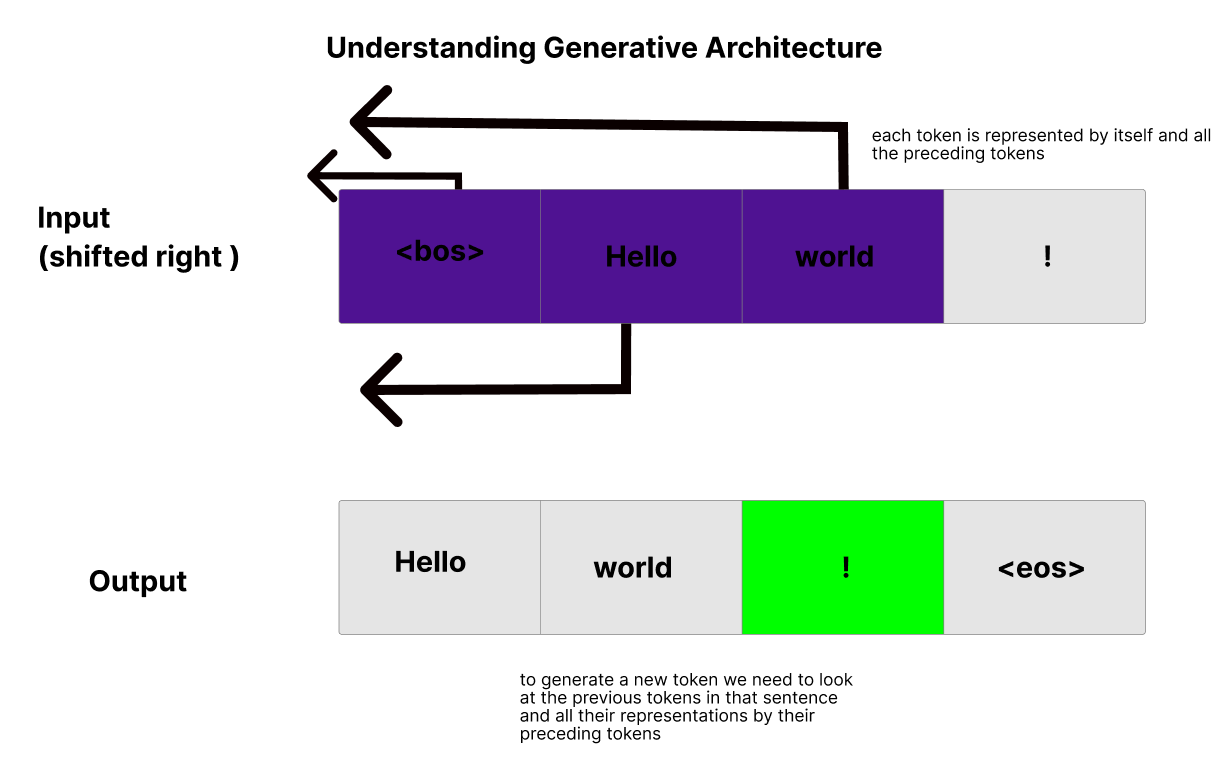 In the Masked Multi-Head Attention Layer, each token's attention is computed using only the current INPUT token and its predecessors. Since the input is shifted right, generating a new token requires the model to consider the vector representations of all previous tokens, including their relationships with preceding tokens. This mechanism underpins how generative AI models function, as illustrated below: