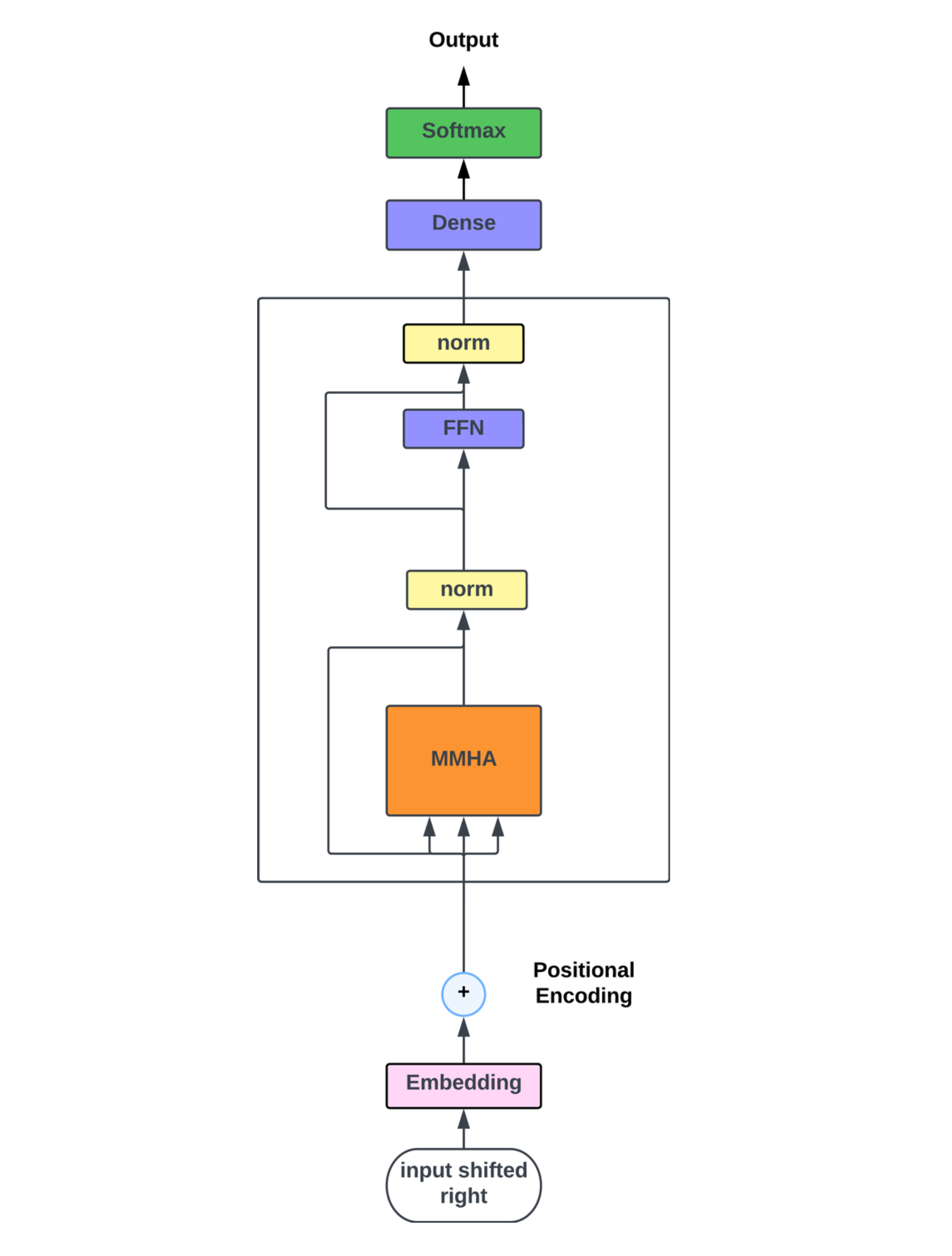 Most generative AI models are built using a decoder-only architecture. In this blog post, we’ll explore a simple text generation model, as illustrated below.