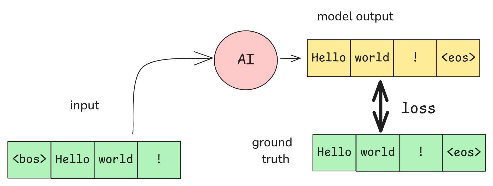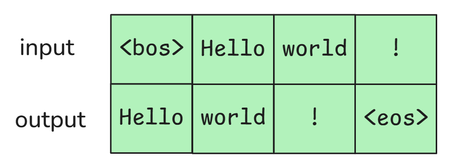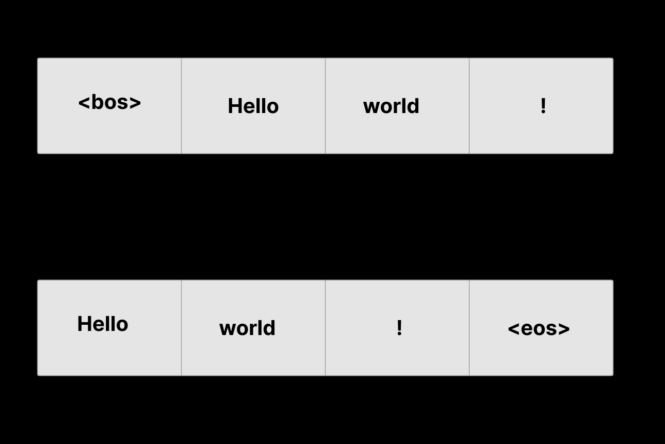 The sentence Hello world ! can be tokenized into three parts: Hello, world, and !. Additionally, two auxiliary tokens, <bos> and <eos>, are appended to represent the beginning of sentence and end of sentence, respectively. This ensures the input is shifted correctly.