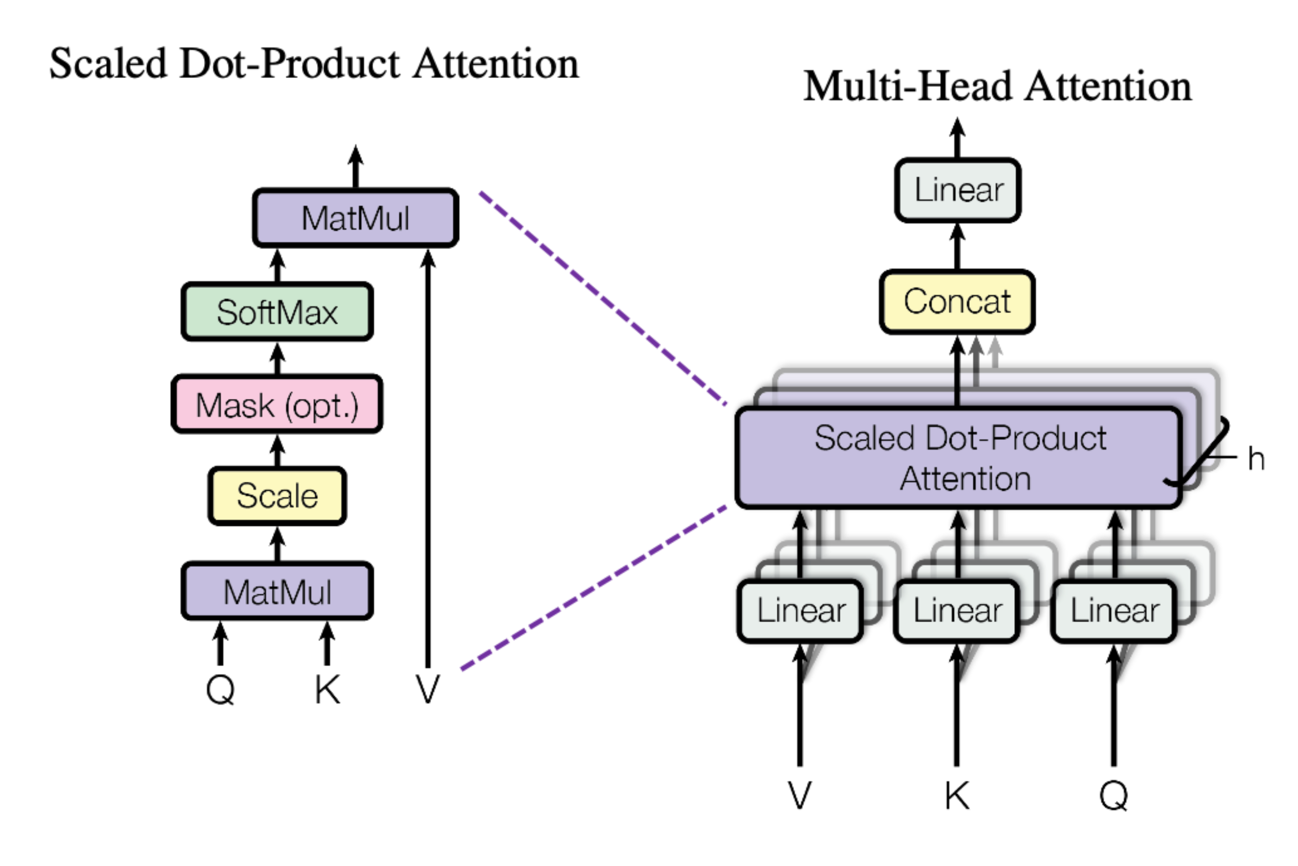 Attention(Q,K,V)=softmax(QKdk)V \text{Attention}(Q, K, V) = \text{softmax}\left(\frac{QK^\top}{\sqrt{d_k}}\right) V