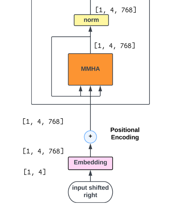 The sequence lengths of the input and target differ, which is handled by the cross-attention layer. The encoder output has a shape of [1,4,768] [1, 4, 768] , while the masked multi-head attention layer output from the decoder is [1,6,768] [1, 6, 768] . Here, the Key (K) and Value (V) come from the encoder, and the Query (Q) comes from the decoder.