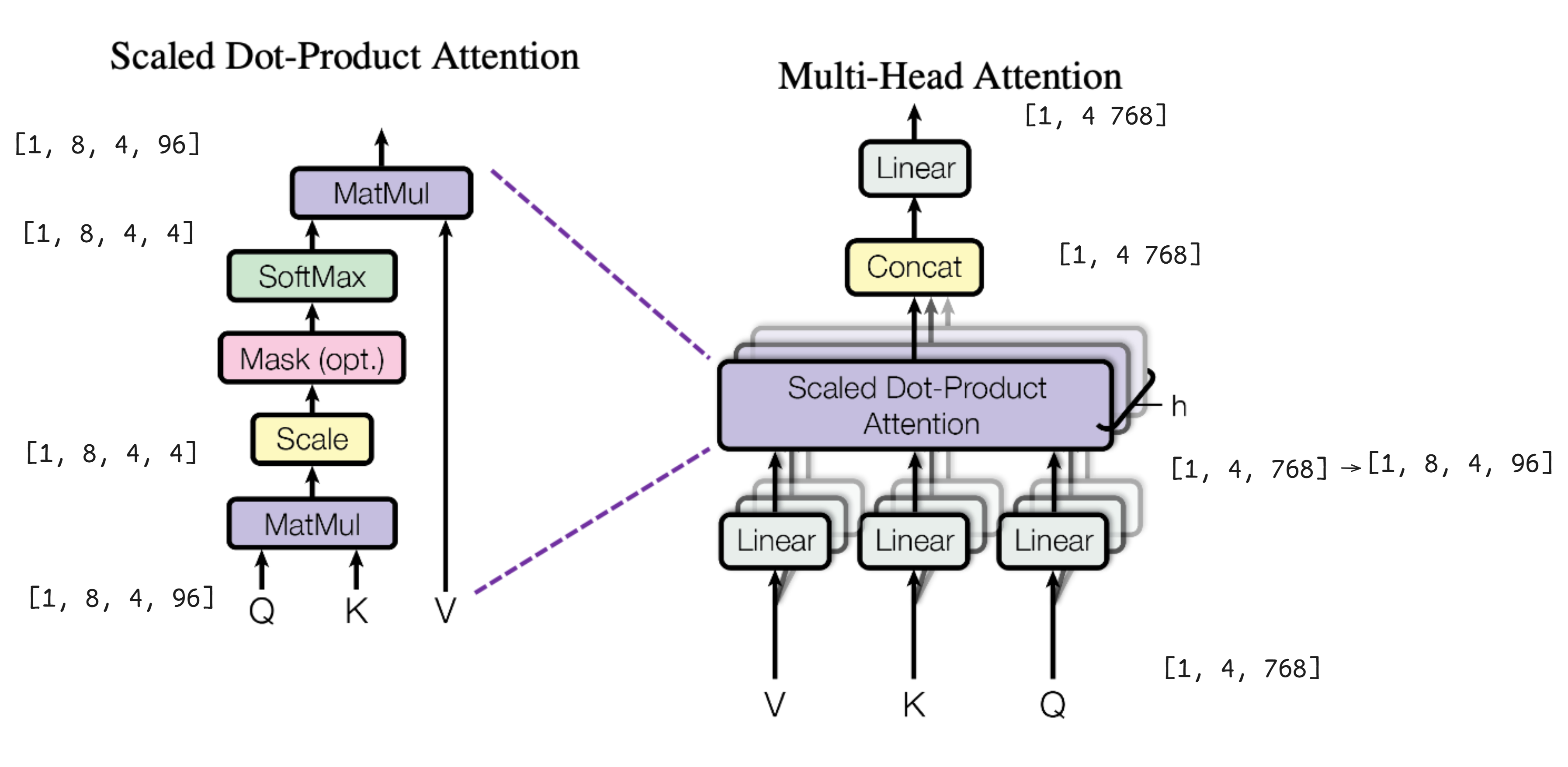 • softmax(QKdk)V=[1,8,6,4][1,8,4,96][1,8,6,96]\text{softmax}\left(\frac{QK^\top}{\sqrt{d_k}}\right) V = [1, 8, 6, 4] * [1, 8, 4, 96] \Rightarrow [1, 8, 6, 96]