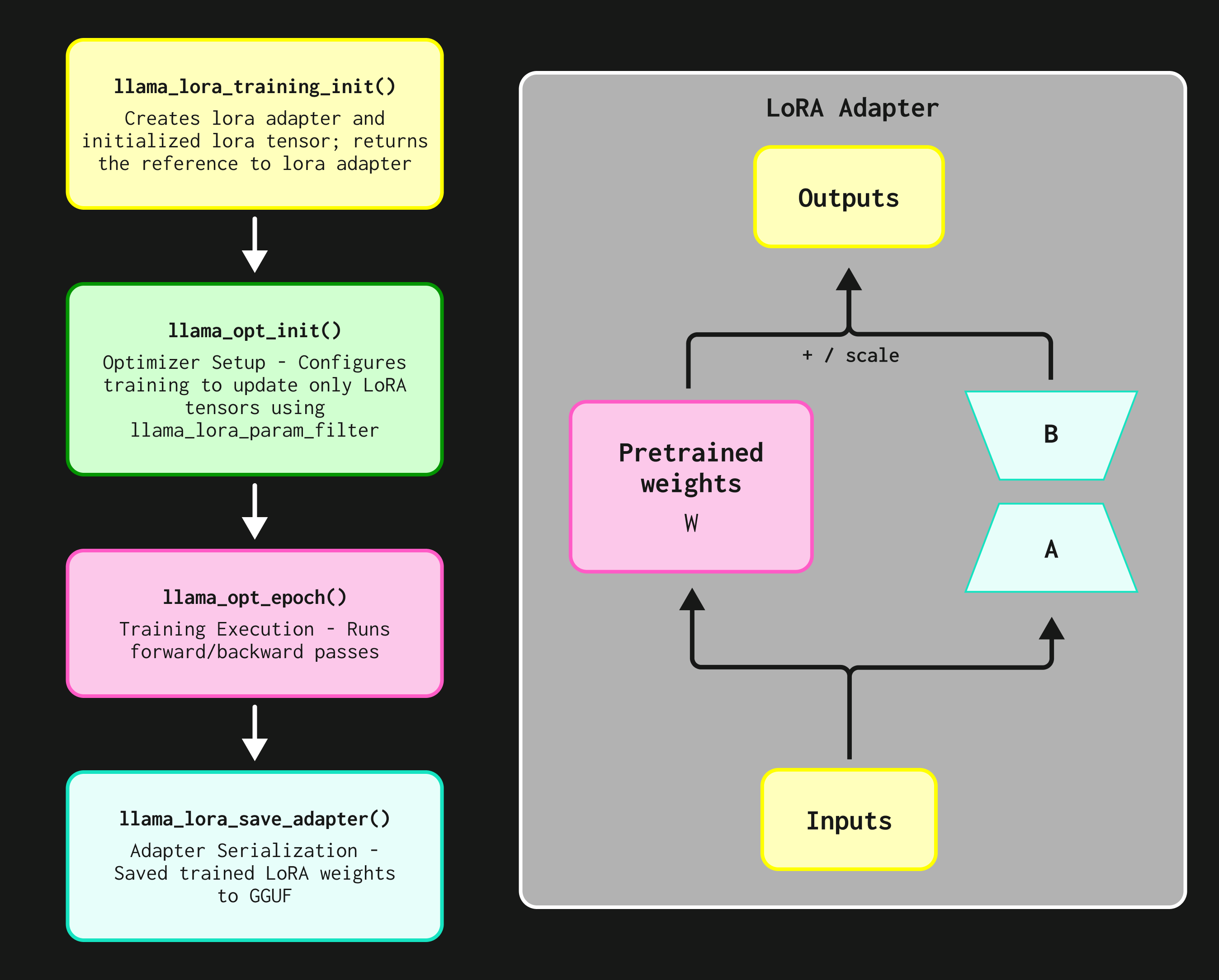 - llama_opt_init(): Configures the training optimizer. We made modifications to accept a parameter filter that freezes the base model weights and targets only the LoRA tensors for gradient updates.