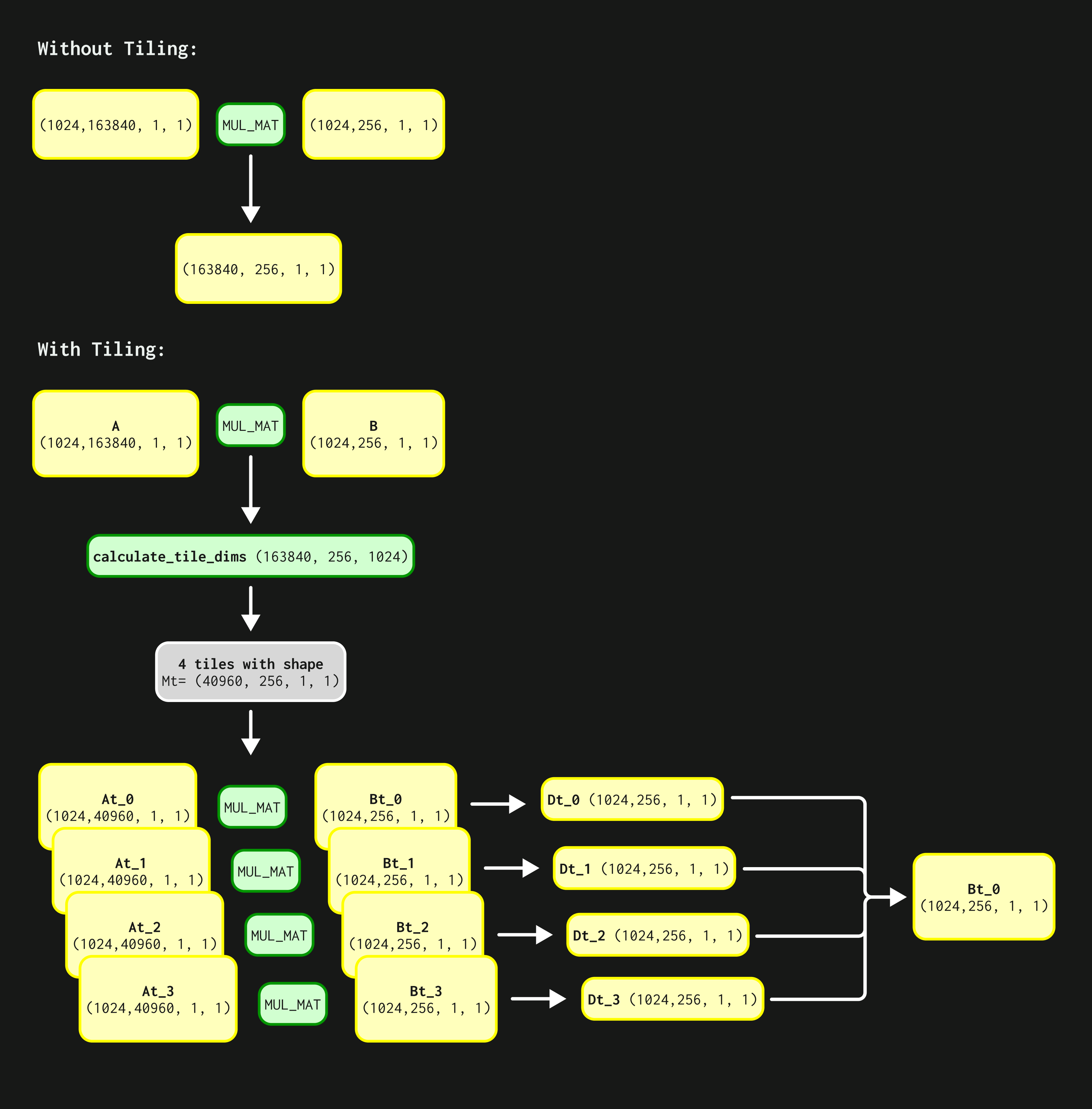 We implemented a dynamic tiling algorithm for MUL_MAT and OUT_PROD. Instead of performing one large matrix multiplication, the operation is broken down into smaller, independent tiles that respect the 128MiB memory limit.
