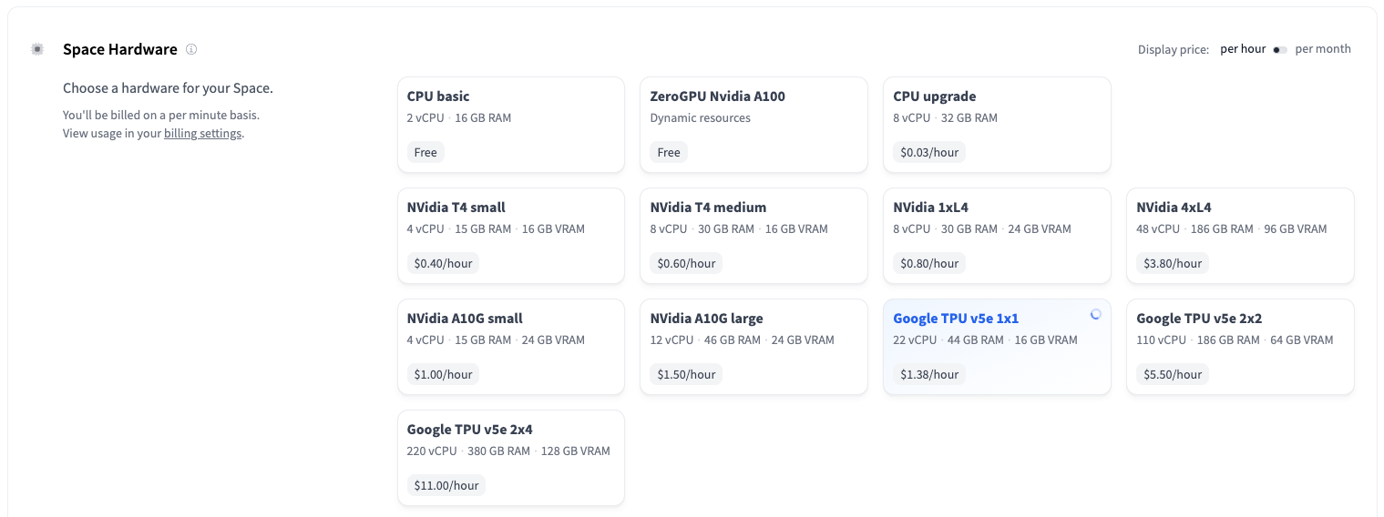 Hugging Face Spaces provide developers with a platform to create, deploy, and share AI-powered demos and applications quickly. We are excited to introduce new TPU v5e instance support for Hugging Face Spaces. To upgrade your Space to run on TPUs, navigate to the Settings button in your Space and select the desired configuration:
