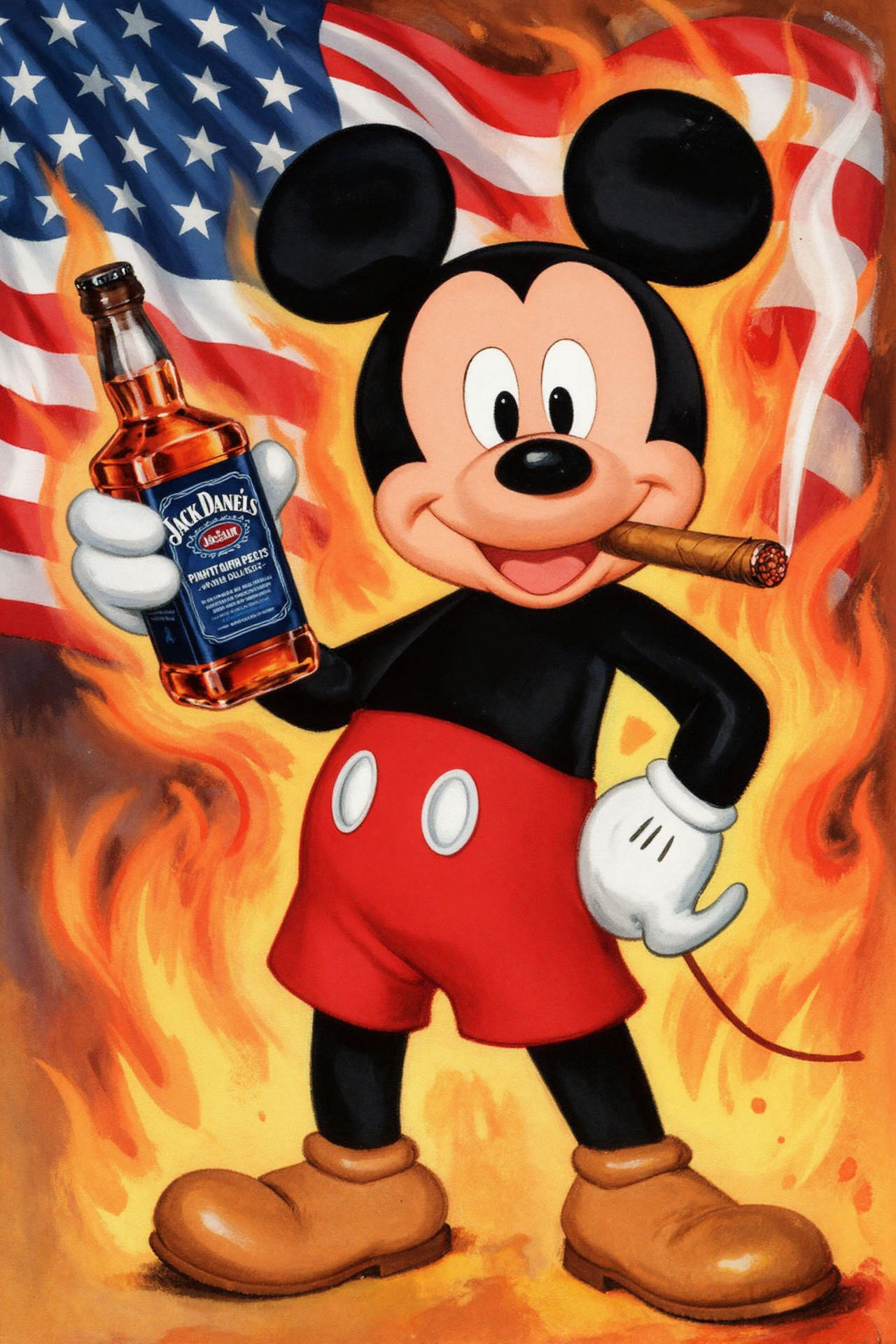 - 5os4m3r1c4n4, 1950s, painting, a painting of mickey mouse holding a bottle of jack daniels in one hand, smoking a cigar in his mouth, in front of waving american flag on fire background, flag on fire,