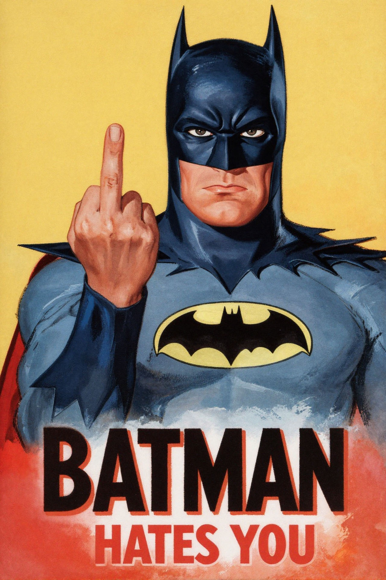 - 5os4m3r1c4n4, 1950s, painting, a painting of batman flicking off viewer with middle finger, angry, 1950s logo text at bottom says "BATMAN HATES YOU"