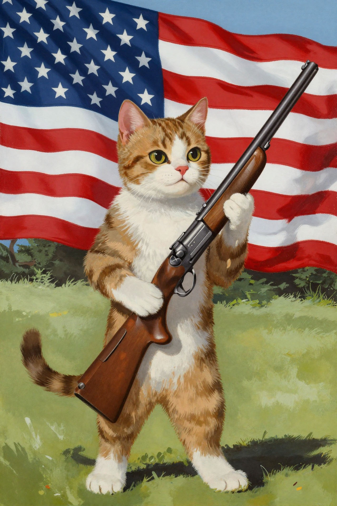 - 5os4m3r1c4n4, 1950s, painting, a painting of a cat holding a shotgun, standing in front of a waving american flag background, outdoors,