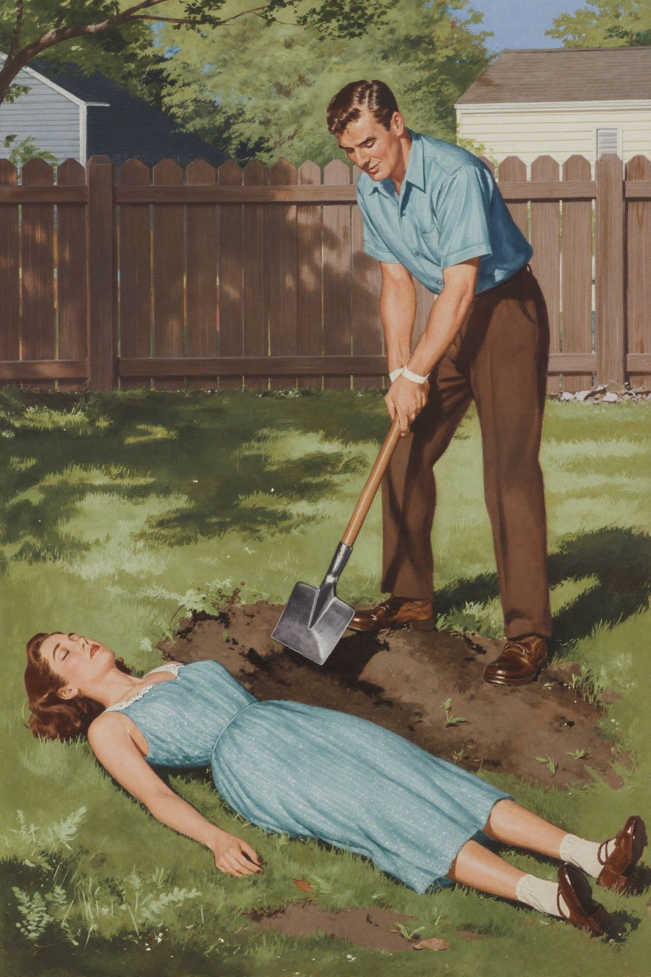 - 5os4m3r1c4n4, 1950s, painting, a painting of a man digging a hole in the ground with a shovel, dead woman eyes closed frowning body on ground, face down on ground next to hole, american suburban backyard, fence, 1950s,