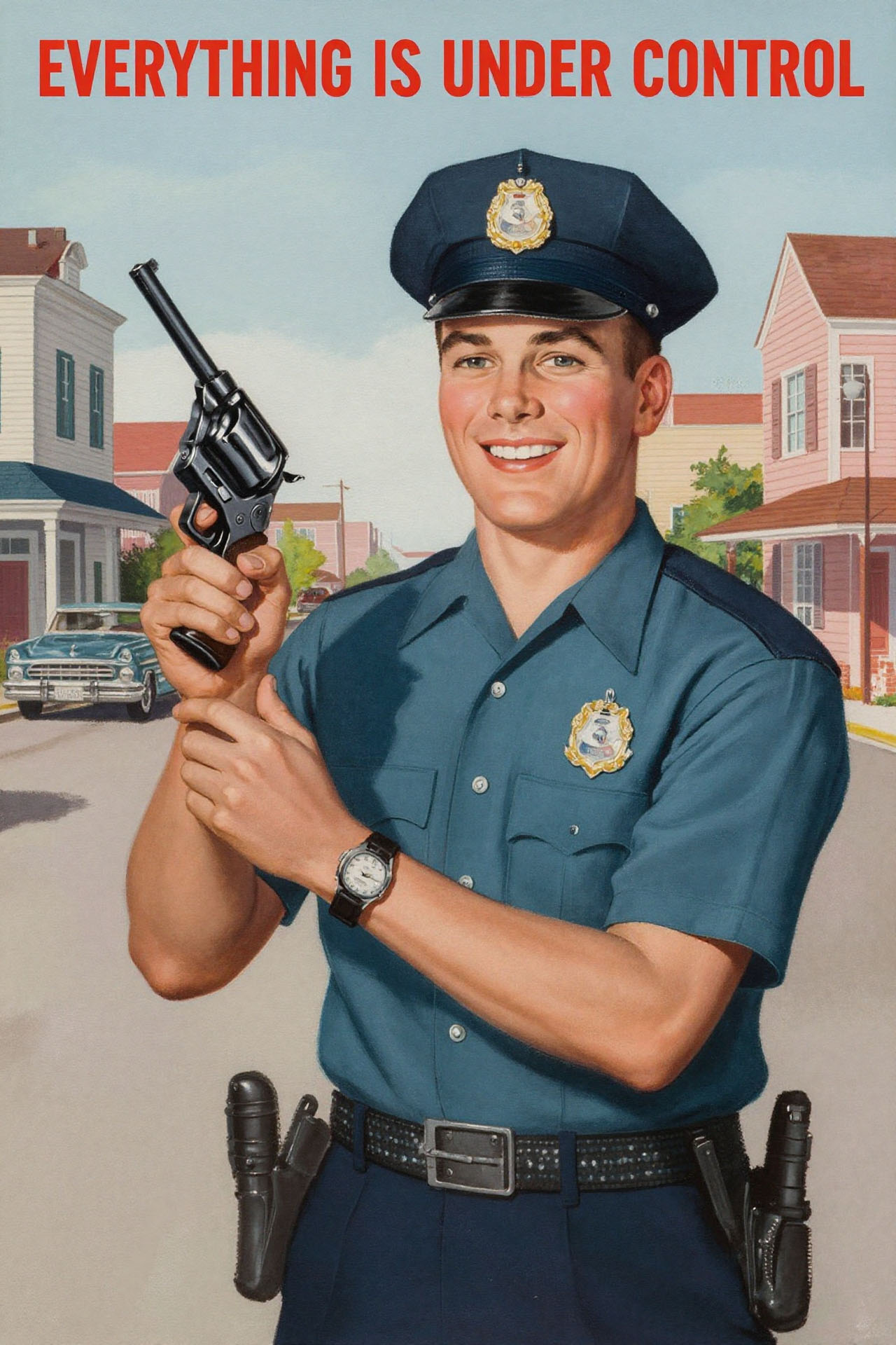 - 5os4m3r1c4n4, 1950s, painting, a painting of a 1950s american police officer smiling, holding a black revolver pistol gun, small american town street in background, text at top says "EVERYTHING IS UNDER CONTROL",