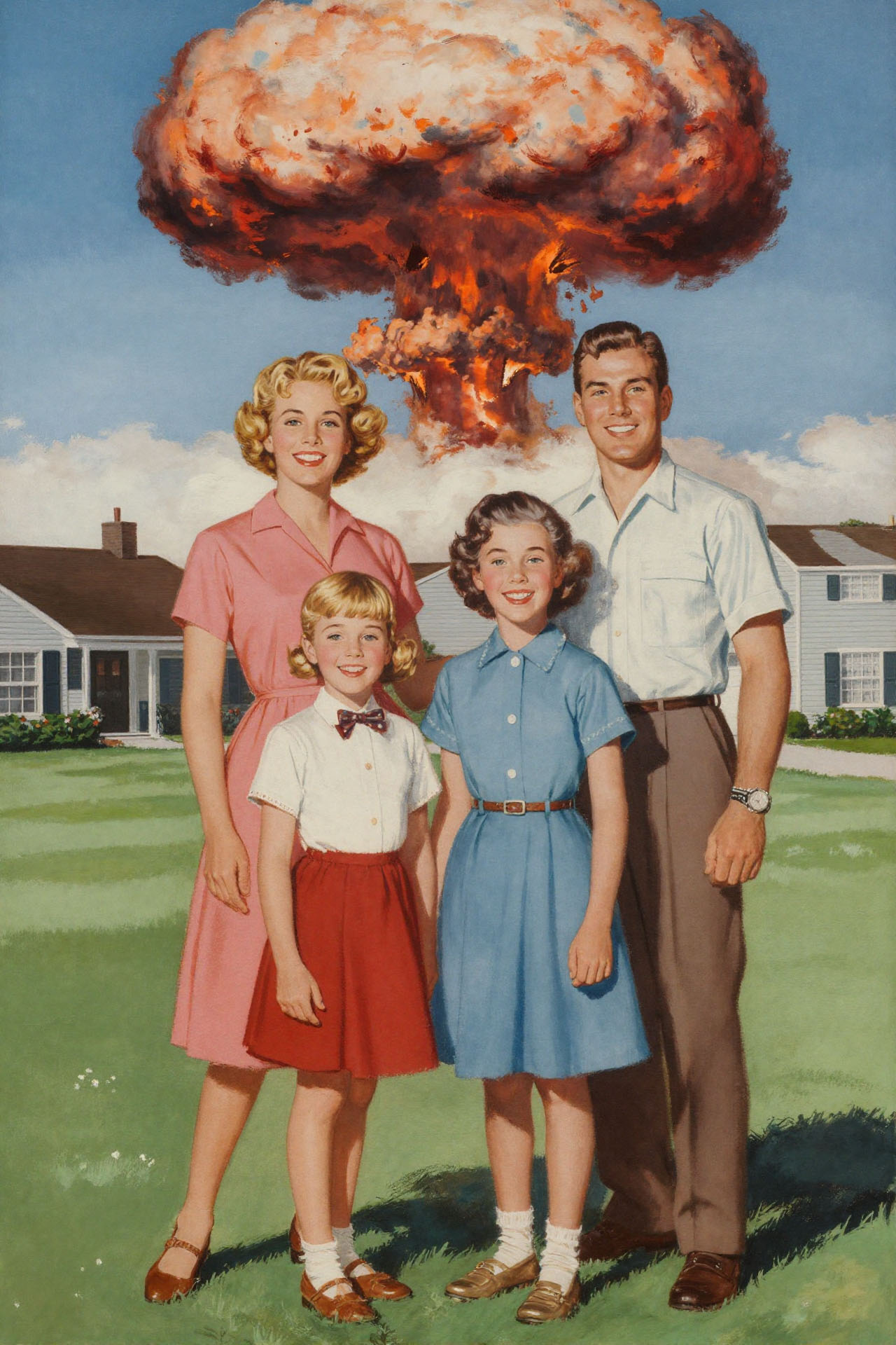 - 5os4m3r1c4n4, 1950s, painting, a painting of a happy 1950s american family standing in front lawn, nuclear explosion mushroom cloud far off in background,