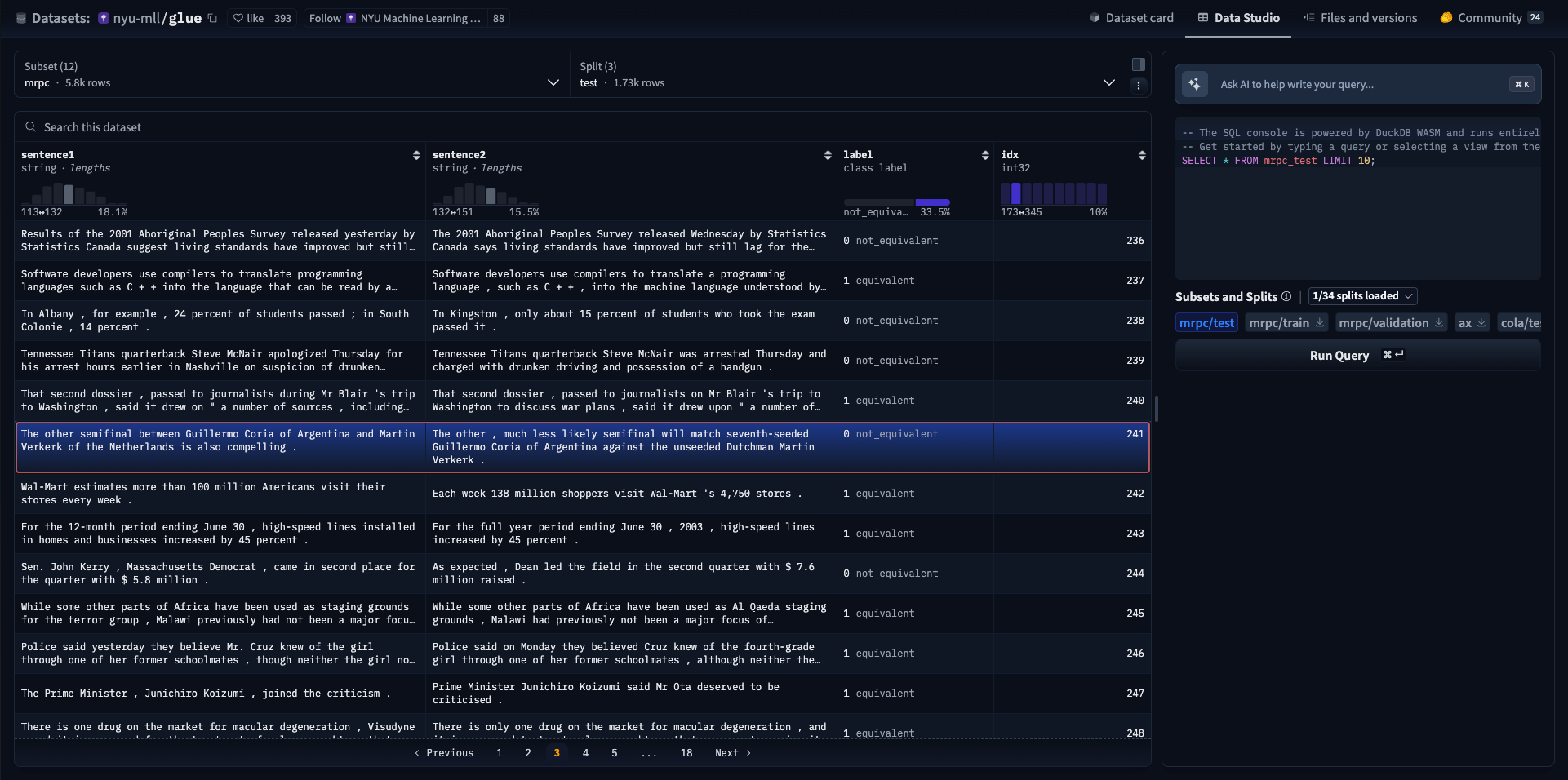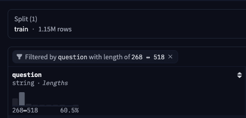 If you click on a bar of a histogram from a numerical column, the dataset viewer will filter the data and show only the rows with values that fall in the selected range. Similarly, if you select one class from a categorical column, it will show only the rows from the selected category.