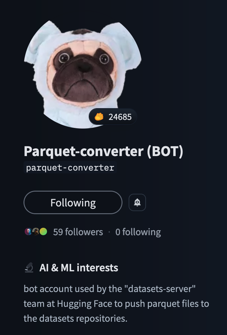 When you create a new dataset, the parquet-converter bot notifies you once it converts the dataset to Parquet. The discussion it opens in the repository provides details about the Parquet format and links to the Parquet files.