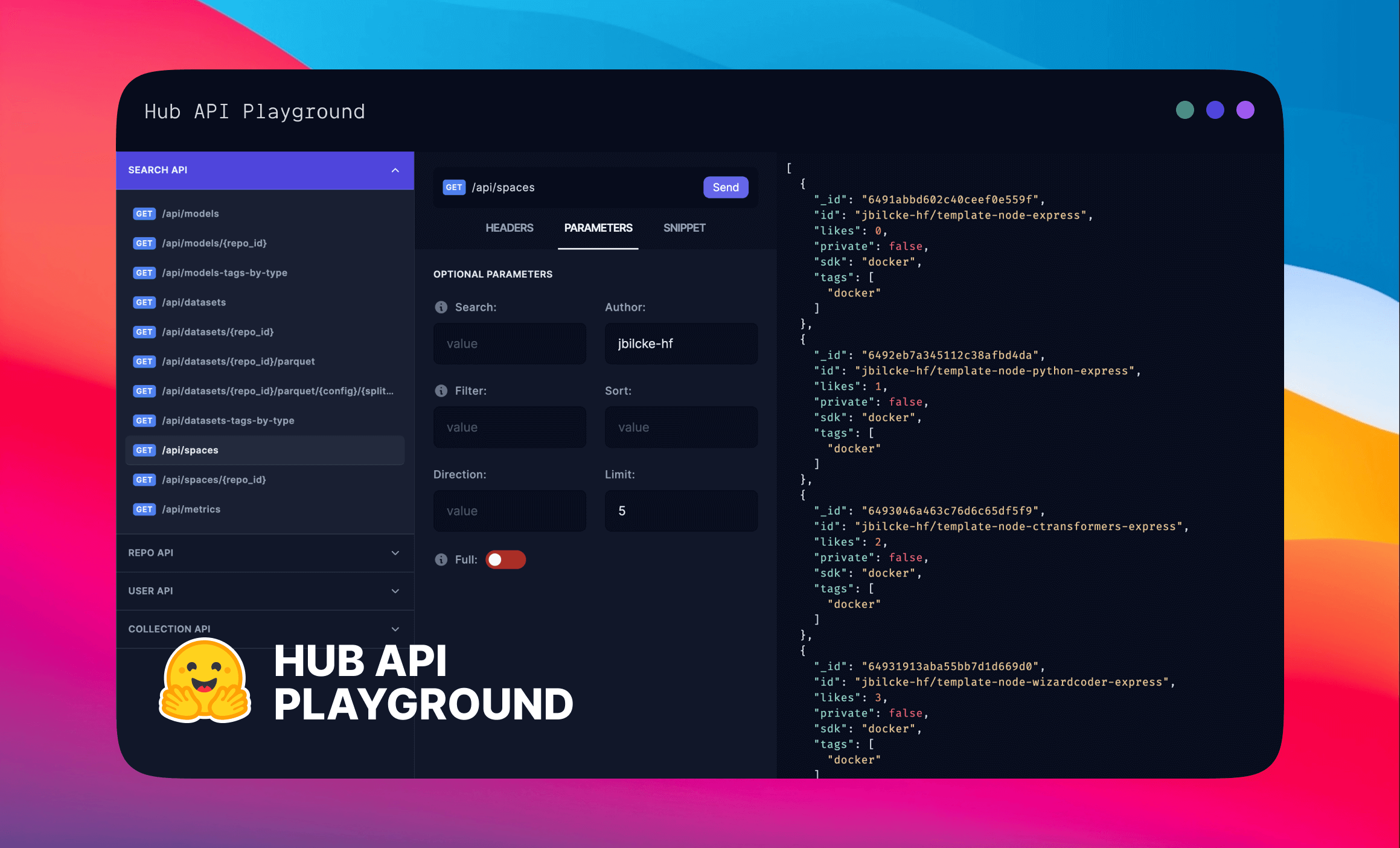 We have open endpoints that you can use to retrieve information from the Hub as well as perform certain actions such as creating model, dataset or Space repos. We offer a wrapper Python client, huggingface_hub, and a JS client, huggingface.js, that allow easy access to these endpoints. We also provide webhooks to receive real-time incremental info about repos. Enjoy!