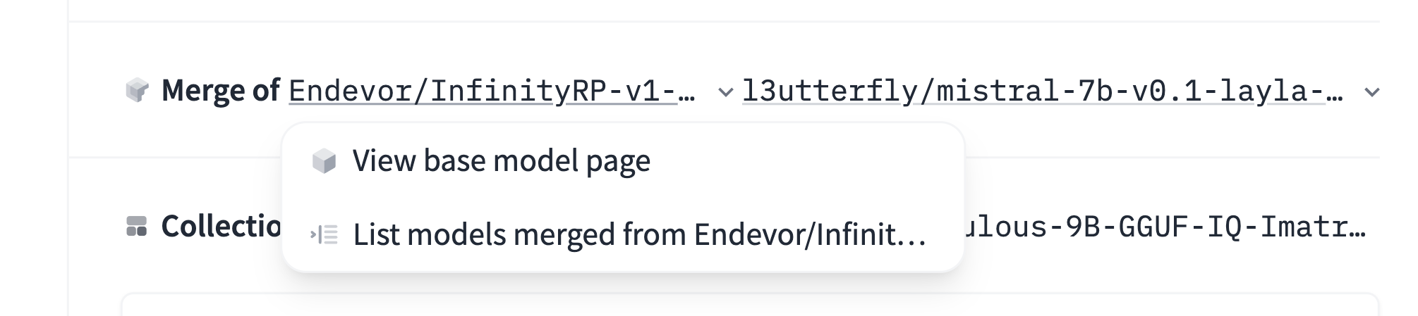- l3utterfly/mistral-7b-v0.1-layla-v4The Hub will infer the type of relationship from the current model to the base model ("adapter", "merge", "quantized", "finetune") but you can also set it explicitly if needed: base_model_relation: quantized for instance.