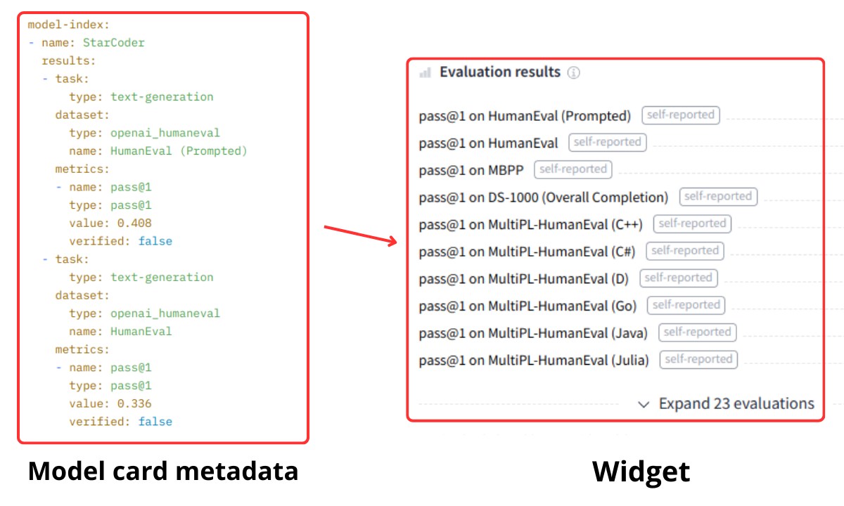 The metadata spec was based on Papers with code’s model-index specification. This allow us to directly index the results into Papers with code’s leaderboards when appropriate. You can also link the source from where the eval results has been computed.