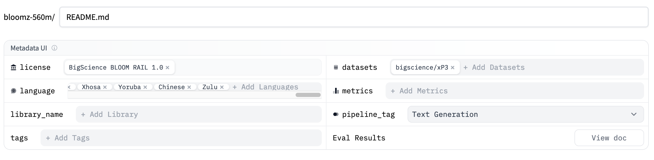 You can also directly edit the YAML section of the README.md file. If the model card doesn’t already have a YAML section, you can add one by adding three --- at the top of the file, then include all of the relevant metadata, and close the section with another group of --- like the example below: