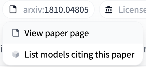 If the model card includes a link to a Paper page (either on HF or an Arxiv abstract/PDF), the Hugging Face Hub will extract the arXiv ID and include it in the model tags with the format arxiv:<PAPER ID>. Clicking on the tag will let you: