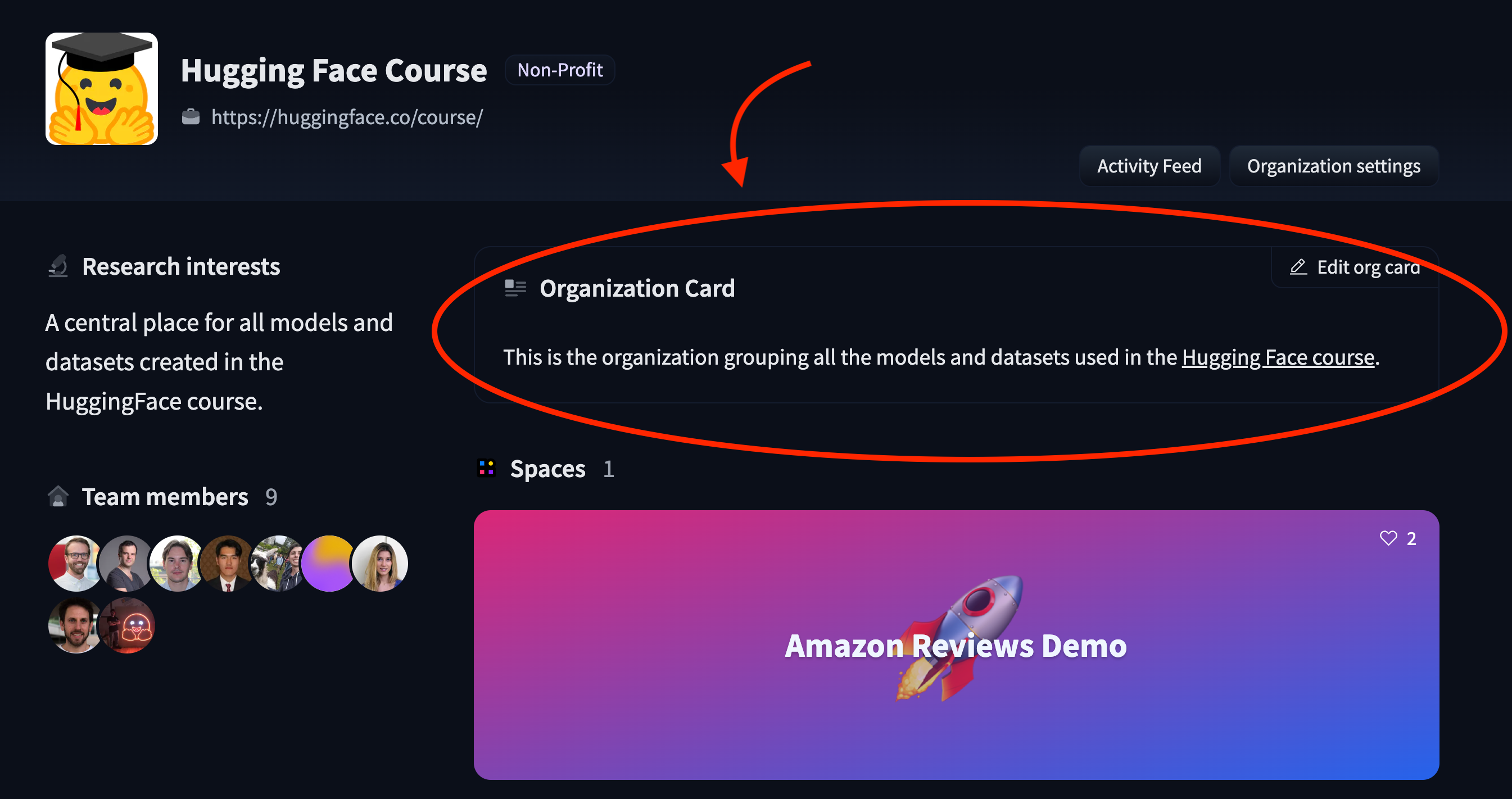 You can create an organization card to help users learn more about what your organization is working on and how users can use your libraries, models, datasets, and Spaces.