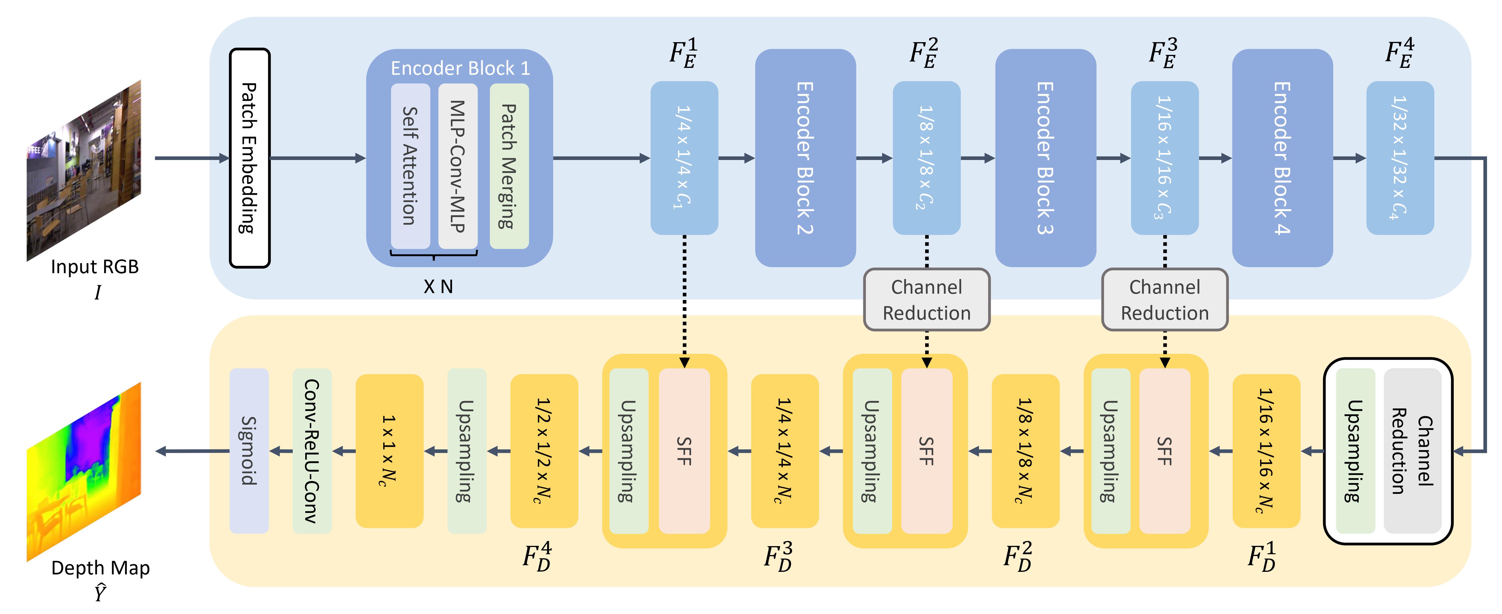 Un dĂ©codeur lĂ©ger prend la derniĂšre carte de caractĂ©ristiques (Ă lâĂ©chelle 1/32) de lâencodeur et lâagrandit Ă lâĂ©chelle 1/16. Ensuite, cette caractĂ©ristique passe par un module de Fusion de CaractĂ©ristiques SĂ©lective (SFF), qui sĂ©lectionne et combine les caractĂ©ristiques locales et globales Ă partir dâune carte dâattention pour chaque caractĂ©ristique, puis lâagrandit Ă 1/8. Ce processus est rĂ©pĂ©tĂ© jusquâĂ ce que les caractĂ©ristiques dĂ©codĂ©es aient la mĂȘme taille que lâimage originale. La sortie est ensuite traitĂ©e par deux couches de convolution, suivies dâune activation sigmoĂŻde pour prĂ©dire la profondeur de chaque pixel.