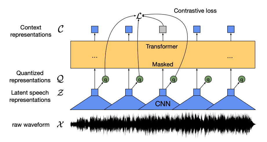 TĂąche contrastive (contrastive task): Le rĂ©seau de contexte est prĂ©entraĂźnĂ© avec une tĂąche contrastive. Le modĂšle doit prĂ©dire la vĂ©ritable unitĂ© de parole quantifiĂ©e Ă partir de la prĂ©diction masquĂ©e parmi un ensemble de fausses, ce qui pousse le modĂšle Ă trouver lâunitĂ© de parole quantifiĂ©e la plus proche de la prĂ©diction.