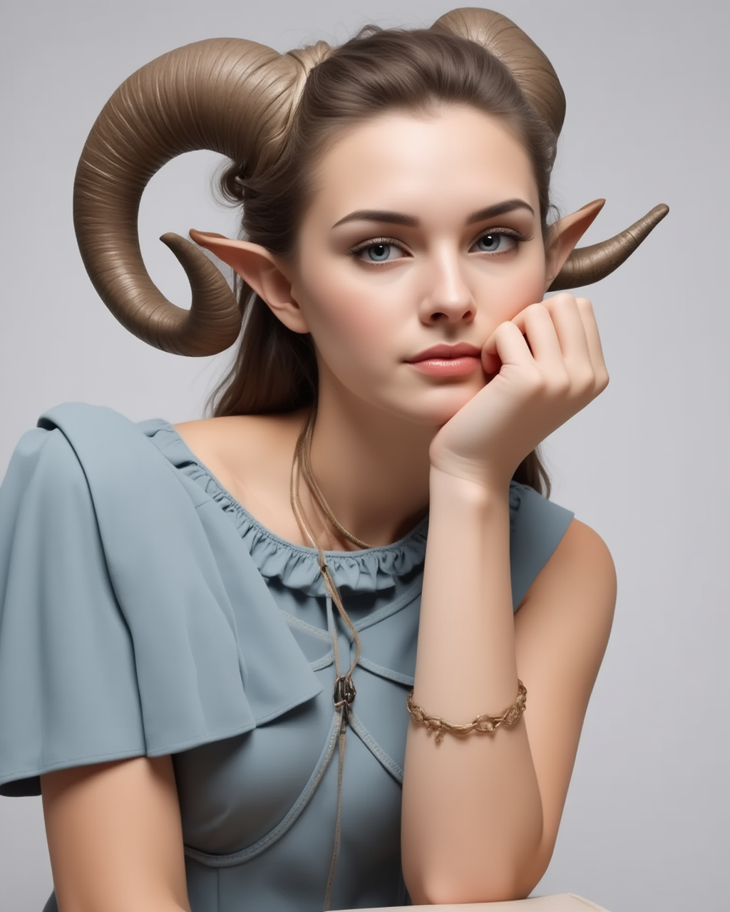 - Convert this sketch into real life version, follow exact structure, a woman with horns