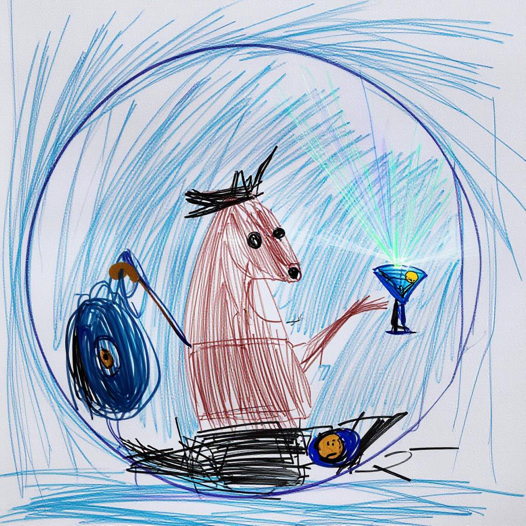 - a horse is a DJ at a night club, fish eye lens, smoke machine, lazer lights, holding a martini