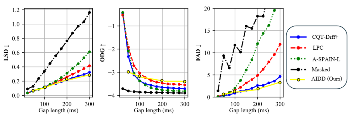 the gap duration to 500 ms. Experimental results demonstrate that our method achieves competitive or superior performance compared to existing baselines, particularly for longer gaps,