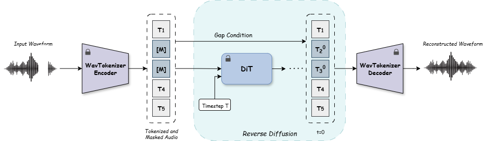 recordings. While prior approaches—including waveform and spectrogram-based diffusion models—have shown promising results for short gaps, they often degrade in quality when gaps