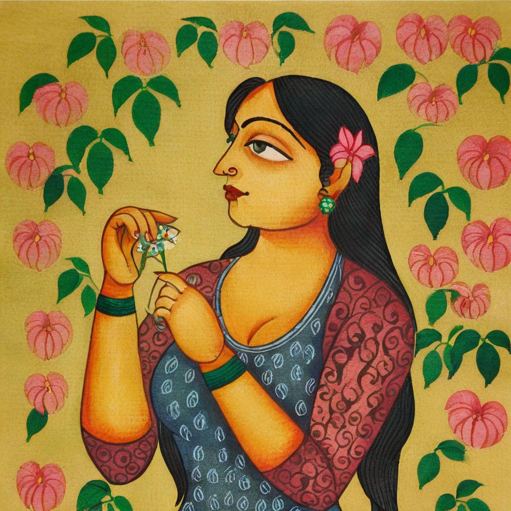 - A painting of a lady holding a flower