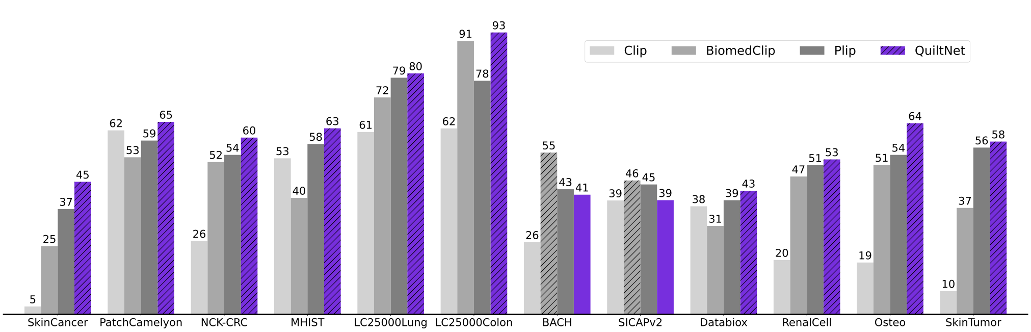 QuiltNet-B-32 is a CLIP ViT-B/32 vision-language foundation model trained on the Quilt-1M dataset curated from representative histopathology videos. It can perform various vision-language processing (VLP) tasks such as cross-modal retrieval, image classification, and visual question answering. QuiltNet establishes new state of the art in a wide range of standard datasets, and substantially outperforms prior VLP approaches: